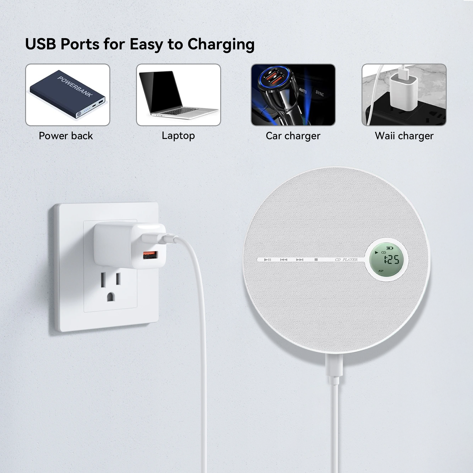 The Tayvos CD player supports USB charging, making it easy to recharge whether you're at home, in the office, or in your car. With compatibility for car chargers, laptops, and power banks, convenient charging ensures your music is always ready to go.