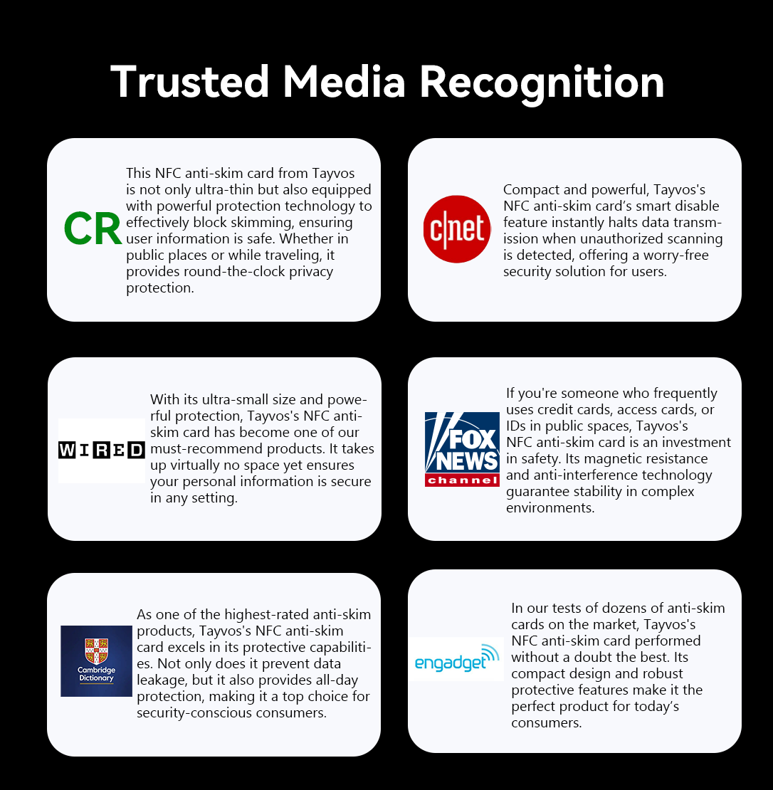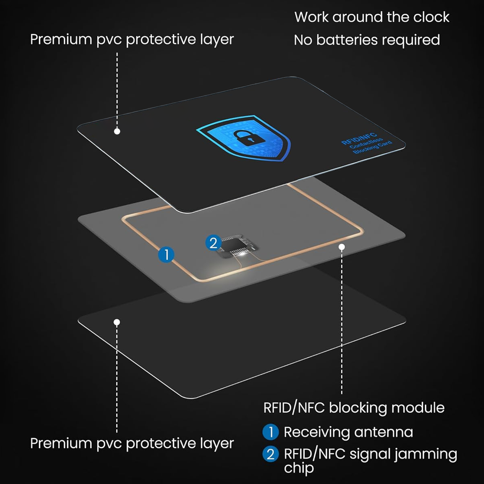 - Anti-skim shielding layer — physically blocks unauthorized NFC/RFID scans, keeping your card data and privacy safe.